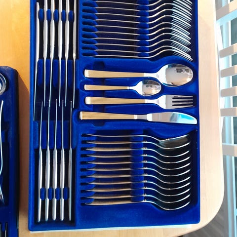 Upea 12 hengen käyttämätön ruokailuväline sarja. On kaikki mahdollinen alkuruuista jälkiruokiin tarjoiluottimia myöten. Nikkeliä/pronssia.