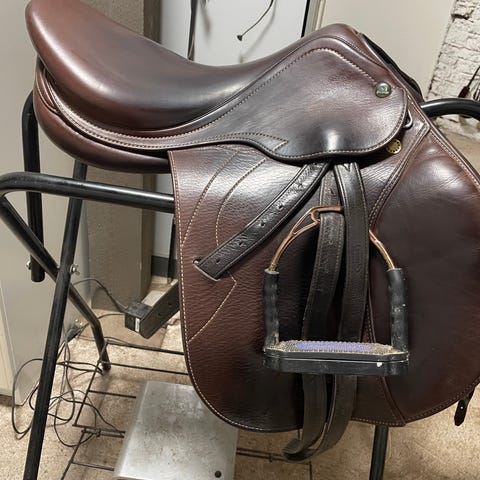 Vähällä käytöllä ollut joustorunkoinen satula.Kaari on vaihdettavissa ja tällä hetkellä oranssikaari paikallaan.Toppaukset on vielä hyvät.