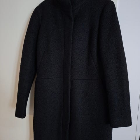 Kaunis VILAN villakangastakki, joka on jäänyt itselle pieneksi. Malli on tyköistuva, helma ja hihansuut levenevät. Takissa on piilonapitus ja kauluksen suussa neppari, jolla kaulus nostetaan ylös. Takki on M-kokoa, mitat kai-kai 46 cm ja pituus olkapäältä helmaan 95 cm.