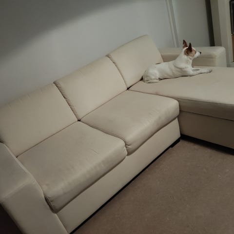 Punainen kangasverhoiltu sohva, jossa on irrotettavat tyynyt ja mustat koristetyynyt. Puinen vitriinikaappi, jossa lasiovet ja useita laatikoita. Pyöreä sohvapöytä, jossa lasinen kansi ja punainen puurunko. Huonekalut soveltuvat olohuonekäyttöön.