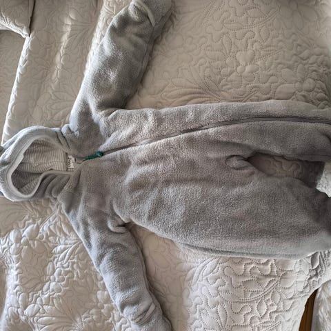 Lindexin hyväkuntoinen, tummanruskea fleecehaalari, jossa on nallekuvioinen pehmeä kangasvuori ja vanu välissä. Haalarissa on käännettävät tumppu- ja tossuosat sekä kiinteä huppu. Haalarin kiinnitys on oikeassa sivussa kulkevalla pitkällä vetoketjulla ja viistossa kulkevalla nepparirivistöllä. Haalarin eteen on koristeommeltuna kolme nallea ja Teddybears-teksti. Ihana, vaikka autossa matkatessa tai vaunuissa nukkuessa.
