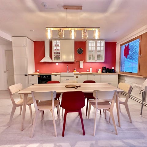Tuolien muotoilu todella hyvä ja mukava istua. Tuoleja 8 kpl.