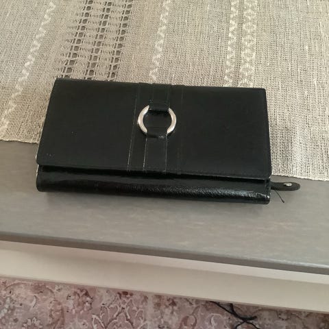 Musta nahkainen lompakko, mitat 15,5 x 9,5 cm. Käytetty, edelleen hyväkuntoinen.