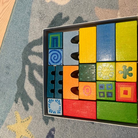 Palikoita on 9 kpl. Puupalikoita voi säilyttää puualustalla. Käytöstä aiheutunutta pientä kulumaa maalipinnassa.