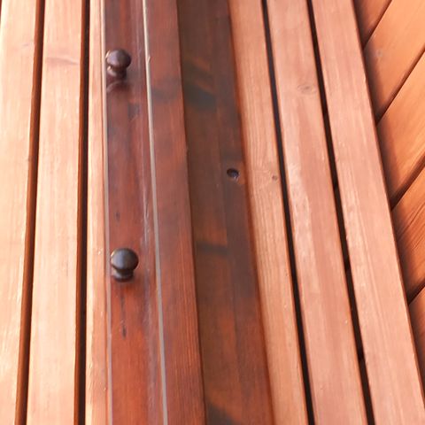 Vanhasta laudasta tehty hylly. Hyllyjen väli 31cm. Alapäästä laudat vinot (voi halutessaan sahata suoriksi), siitä syystä hylly nojaa seinään vain yläpäästään.