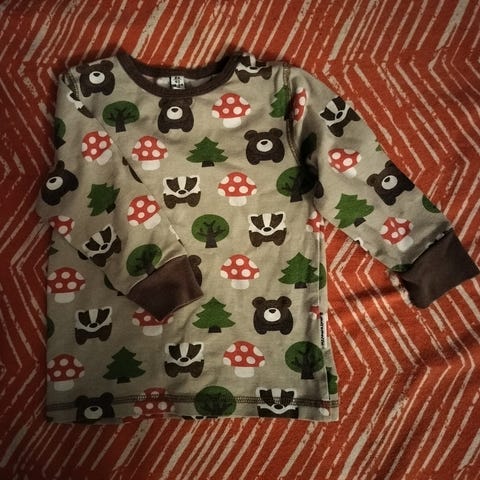 Maxomorron pöllöpaita. Väri beige/vaaleanpunainen ja vihreä