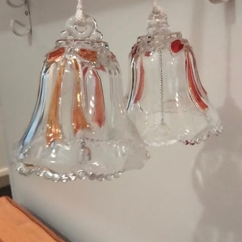 Lasinen koriste- esine soittokellot. Korkeus 6 cm, leveys n. 5,5 cm, käyttämätön. Katso myös muut ilmoitukseni!