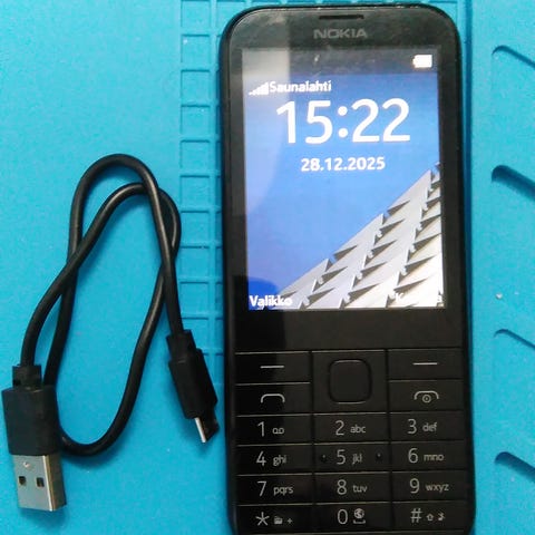 Kuvan puhelin, toimii ja akku lataantuu. Mukana usb-latauspiuha.
