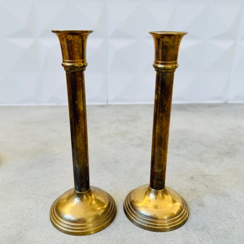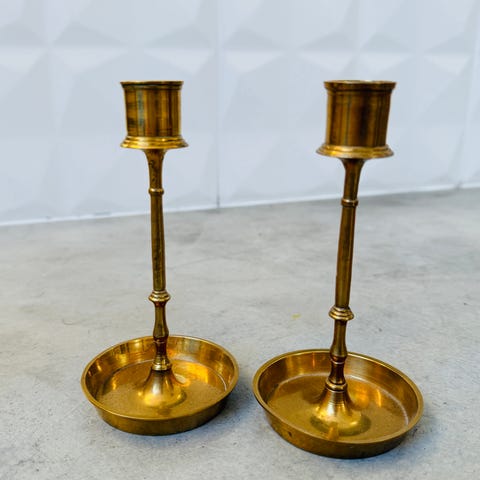 Vanhat messinkiset kynttilänjalat pikkukynttilöille, 1900-luvun ensimmäiseltä puoliskolta.