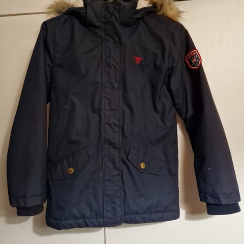 Kappahl:n Hampton Republic -sarjan erittäin hyväkuntoinen tummansininen talvitakki kullanvärisin yksityiskohdin (myös sisäpuolella, kuva 3). Takki on tuulen- ja vedenpitävä (5000 mm) sekä hengittävä. Siinä on irrotettava ihanan pehmeää teddyvuorta oleva huppu, jossa on irrotettava tekokarva. Takissa on vahva vetoketju- ja nepparikiinnitys, kaksi taskua neppareilla ja kiristysmahdollisuus vyötäröllä (kuva 3).