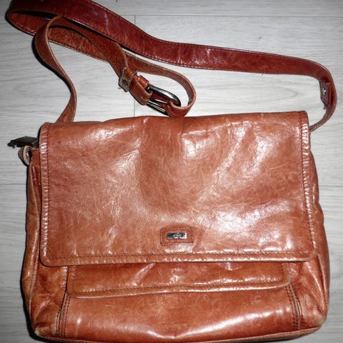 Siistikuntoinen , vähän käytetty nahkalaukku. Leveys 20-22, 24 cm korkeus.