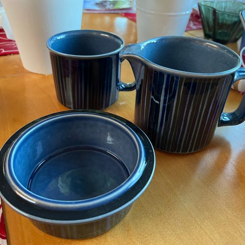 Arabia Kosmos sininen kulhot 1 kpl pienempi + 1kpl isompi + kansi 1 kpl. Myydään vain yhdessä.Kuvissa mitat. Kuvat salamalla ja ilman, siksi väri eroaa. Huomioiden ikä, kunto todella hyvä.