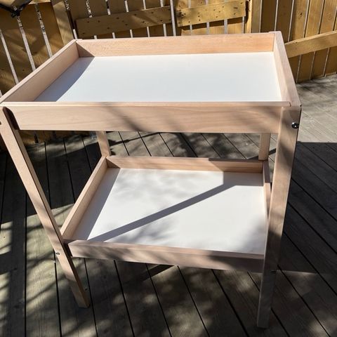 A wodden changing table from a carpenter in very good condition. Can be attached on top of a sideboard/comode/table. The surface measures 80 x 68 cm. Pick up from Pikku Huopalathi.