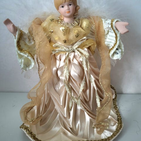 Soittava jouluenkeli, korkeus 9 cm. Kullanväriä on hieman selkäpuolelta kulunut pois, muuten ehjä. Postitus tai nouto.