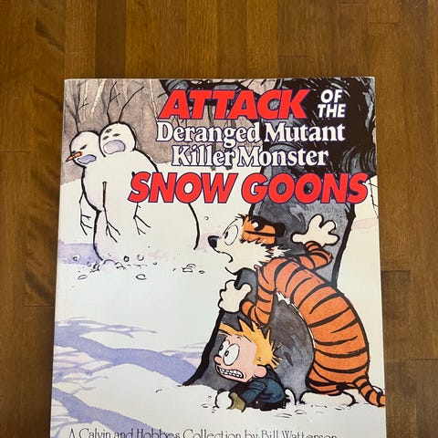 Ethän tingi kiitos. Ensimmäinen painos Bill Watterson Calvin and Hobbes Treasury, englanninkielinen Lassi ja Leevi. Kannesta näkee, että on avattu koska on pehmeäkantinen kirja. Ei mitään jälkiä tai taittumia muissa sivuissa tai takakannessa. Tuskin luettiin edes tätä. Hyvä lahja lahjaidea joululahja.