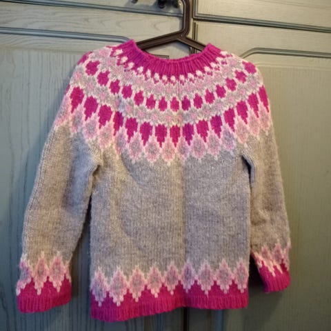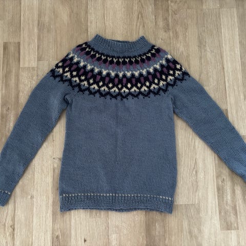 Kudottu villapaita, arviolta koko 150cm. Väljähkö malli. Olka-helma n.60cm, kaulus-hihansuu n.65cm.