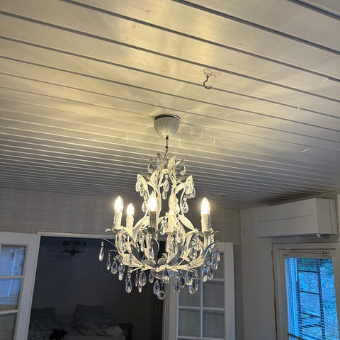 Kaunis, koristeellinen kattokruunu, jossa paikka 4:lle pienikantaiselle (kynttilä)lampulle.