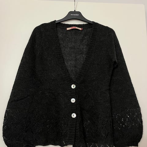 - Musta Indiskan neuletakki, jossa kauniit koristekivet hihoissa, helmassa ja kauluksessa. Kauniisti levenevät hihat ja väljä helma. Napitus. Koko M. HINTA 5 €.