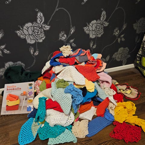Vanha virkattu neliön muotoinen liina, koko on 35x35cm. Voin postittaa.