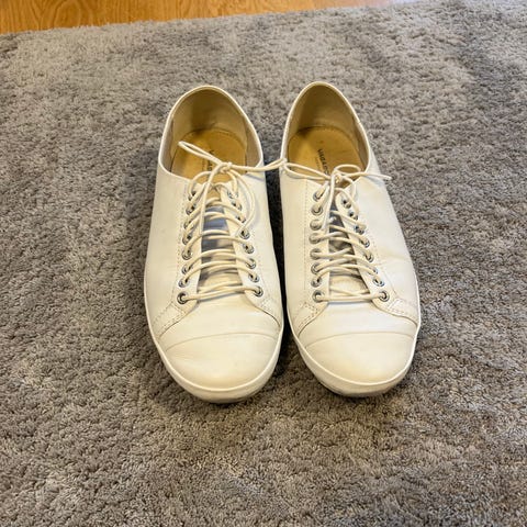 Vähällä käytöllä olleet, edelleen hyvin siistissä kunnossa. Pesty juuri ja sen vuoksi toisessa kengässä pientä kellastumaa saumoissa. Lähtee varmasti esim. auringossa valkaisemalla.