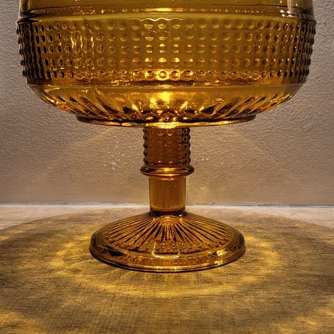 Barokki-sarjaan kuuluva vihreä tarjoilukulho, jonka on Riihimäen Lasille suunnitellut Erkkitapio Siiroinen. Halkaisija 20 cm.