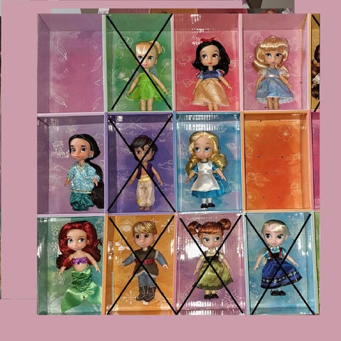 Pocahontas, Tinker Bell, Snow White, Cinderella, Belle, Rapunzel, Ariel, Kristoff, Anna, Elsa, Tiana, Jasmine, Lilo, Aladdin ja Alice