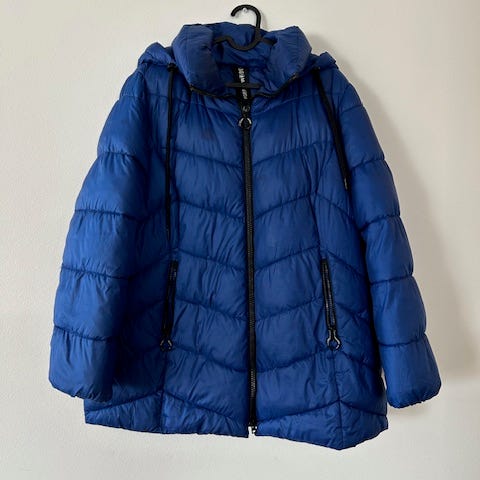 Italialainen Puntododicin takki. Koko oikeammin ehkä L. Todella kevyt. Käytä sellaisenaan tai laita kylmempinä päivinä paksumman takin alle. Saa pakattua pieneen pussiin ja siksi kuvassa näyttää ryppyiseltä. Neppareilla kiinnitys ei vetoketjua.