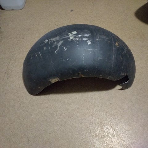 Myydään moottoripyörän takalokasuoja josta katkaistu takaosasta pätkä aikoinaan pois. 1920-1950 välille tuo varmasti iältään sijoittuu, mutta varmuutta valmistajasta ei ole. Oma veikkaus Harley Davidson, BSA, Raleigh tai joku muu vastaava.