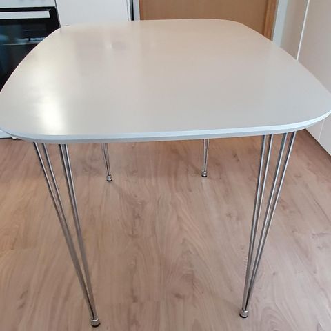 Valkoinen suorakulmainen ruokapöytä, pinta korkeakiilto. Pöytään kuuluu neljä mustaa pehmustettua tuolia, joissa on metalliset jalat. Pöydän pinnassa näkyy pieniä käytön jälkiä.