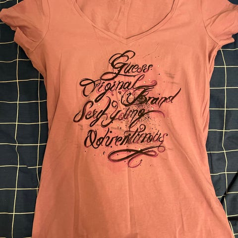Guess merkkinen lyhythihainen paita. Naisten t-paita koko XL. Guess los Angeles. Minusta paidassa on vähän pienehkö koko. Ehkä M koolle voi olla hyvä paita. Vähän jäi tolle mallille löysäksi. Hienot timantit etupuolella sekä kulta ja hopean väristä glitteriä. Vähän on jo käytönjälkiä. Pitkä ja vartalonmyötäinen paita malliltaan.