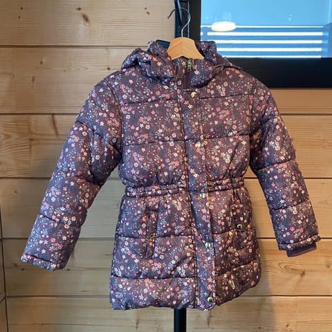 Pampolina-merkkinen paksu nätti toppi paljeteilla ja kirjailuilla. Koko 128 cm. Koristelut lilaa ja pinkkiä. Irrotettava huppu, jossa yksi heijastinosa irronnut. Saa siistiksi purkamalla vain ompeleen. Fleesevuori. Hihoissa nepparit. Kiristys vyötäröllä. Pidetty satunnaisesti kauppa / mekkotakkina.