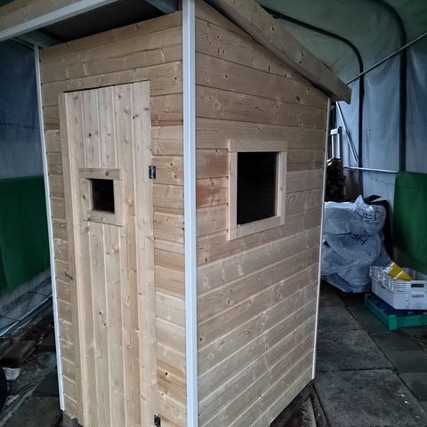 120cm leveä ja 150cm syvä. Takana luukku kompostoivaa pönttöä ajatellen. Peltikatto