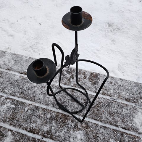 Viinipulloteline kahdella kynttilänjalalla mustaa metallia. Korkeus 40 cm ylempi/30 cm alempi. Alahalkaisija 18 cm. Viinipullotelineen pituus 36 cm.