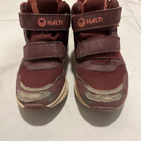 Ominaisuuksiltaan vielä loistavat kengät, ainoastaan ulkoisia kauneusvirheitä. Toisen kengän päälyskankaasta etuosasta kangas hieman nirhautunut (kuva), takaosasta Halti-teksti osittain kulunut. Eläimetön/savuton koti. Sijaitsee Jäälissä, kulkeutuu omien menojen mukana Ouluun.