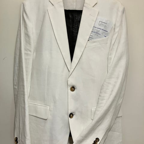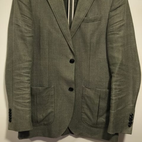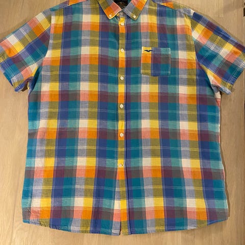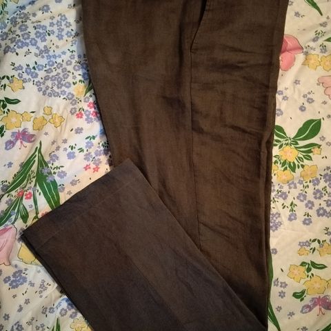 Kellotaskulla, kahdet takataskut, upslaakit, 100 pellava. Kerran pestyt, siksi rypyssä.