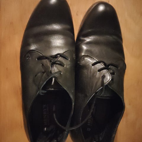 Käsintehdyt suomalaiset reunoskengät, puolipohjatut. Pieni osuma tullut oikeaan pariin (kuvassa) ja ommel jälkikäteen korjattu päällisessä.