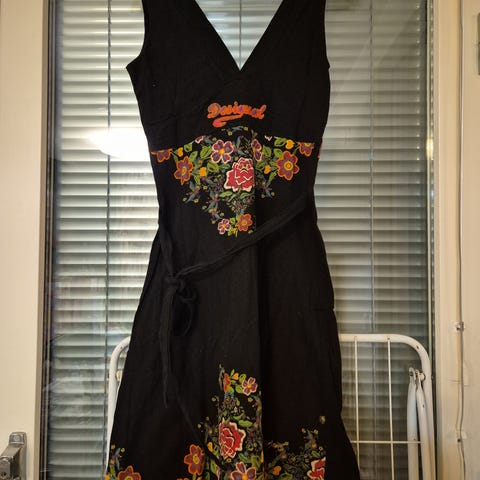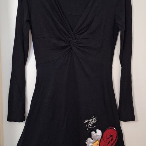 Myydään musta ohutta neulosta oleva Desigual M kokoinen Vapaa-ajan Mekko. Hihaton, V-kaula-aukkoinen ja joustava.