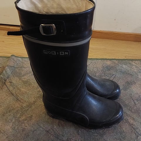 Täysin käyttämättömät, alkuperäiset Nokialla valmistetut mustat kumisaappaat. Saatavilla koot 37 ja 38. Erinomainen tilaisuus hankkia laadukkaat suomalaiset saappaat, joita ei enää valmisteta!
