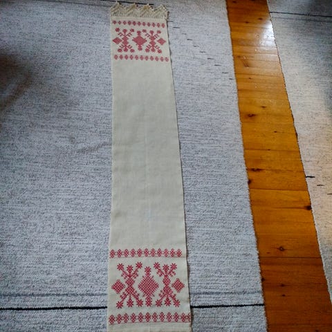 Käspaikka, uusi, Koko 29*149, pellava. Valkoinen ja vaaleansininen. Voin laittaa postin tai matkahuollon kautta.