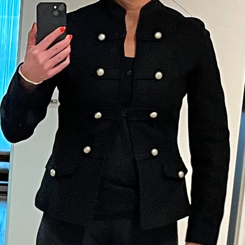 Hyväkuntoinen, tumman harmaa (melkein musta) koon 38 takki. Pituus 80. Kai-kai 50.