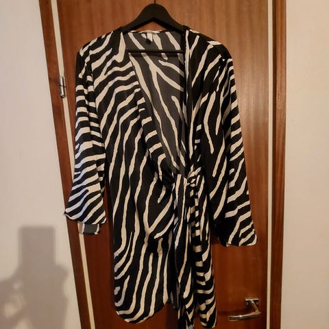 Vaaleanpunainen neulosmekko vuorilla, neuloksessa mukana hopealankaa. Kokomerkintä 8. Joitakin pieniä langanvetoja, jotka kuitenkin saa vedettyä piiloon neuloksen nurjalle puolelle.