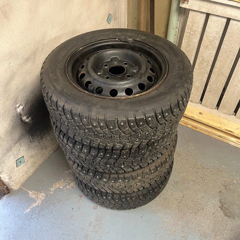 Nissan primerassa olleet talvirenkaat 4x114.3 ja näissä oli toinenkin jako, joka taisi olla 4x100. 7x16 et40. kr noin 68mm. Vanteissa jo jälkeä, mutta silmämääräisesti näytti pyöreiltä.. Renkaat ovat vanhat 13-15 vuoden leimat, mutta nastat hyvin tallella ja pintaa kahdessa reilut 7,5mm ja kahdessa 8,5mm. Yksi keskilätkä rikki.