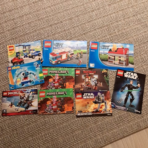 Kuvien setti Lego ohjekirjoja. Vaihtelevassa kunnossa, joistakin ohjeista puuttuu sivuja.