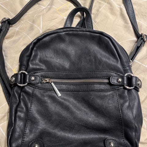 Vihreä nahkareppu. Korkeus n. 40 cm, leveys samoin n. 40 cm. Alunperin on ollut myös vuorikangas. Se on otettu kuluneena pois.