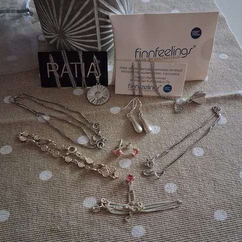 Setti sisältää: kaulakoru, rannekoru, sormus ja korvakorut. Kaulakorusta putosi 2 pientä kiveä.
