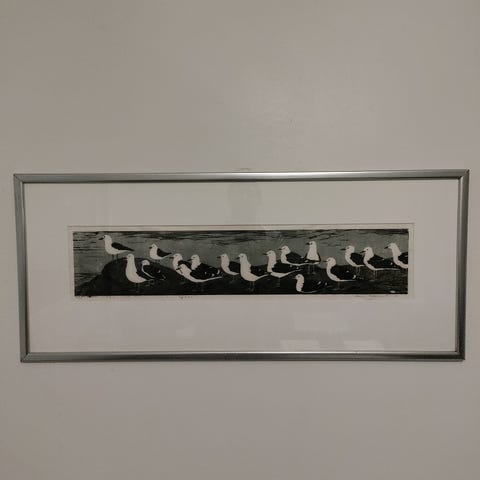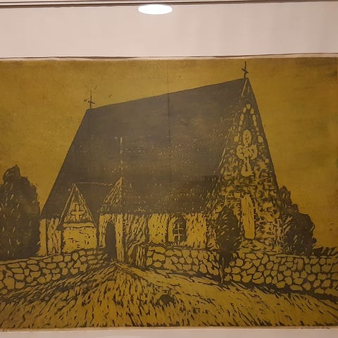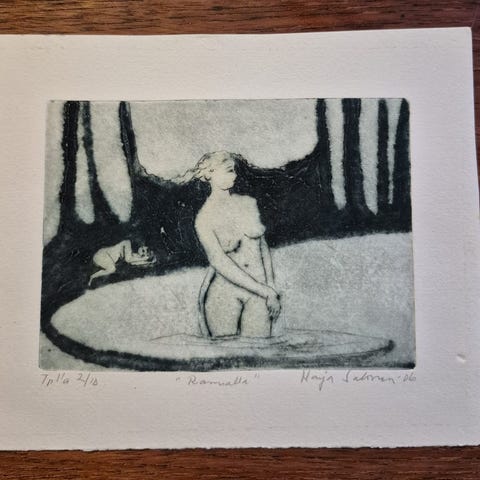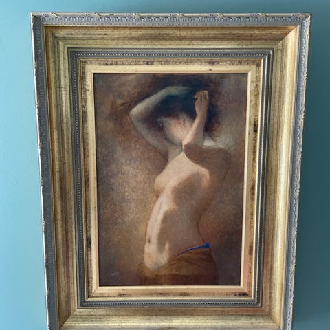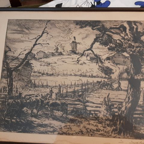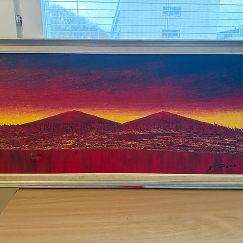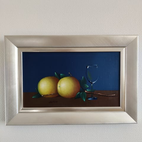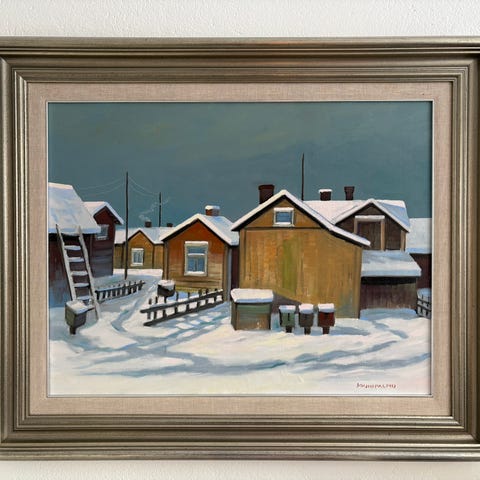 Markku Salon maalaus, jonka taiteilija kertonut maalaanneensa opiskeluajoiltaan Kankaanpään taidekoulussa -73. Koko kehyksen kanssa 95*75cm