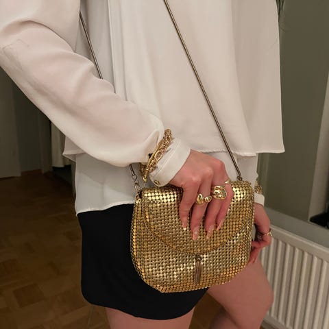 Käyttämätön itämainen käsilaukku, satiinimainen pinta. Olkahihna sisäpuolella, nappi edessä.