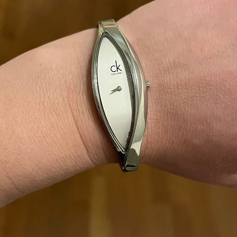 Myydään kauniin yksinkertainen Calvin Kleinin teräksinen rannekello. Kellotaulun sävy vaihtelee valotuksen mukaan lähes mustasta turkoosinlilahtavaan (ks. kuvat). Kello 12:sta kohdalla kolme pientä "timanttia". Ostettu kesällä 2018. Oikein hyväkuntoinen ja siisti, joitakin hiusnaarmuja kellotaulussa, rannekkeessa ja takakannessa käytön jäljiltä. Rannekkeen ylimääräiset kaksi palaa tallella. Käy aikaa! 🙂
