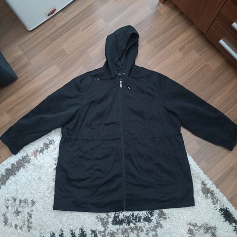 Tummansininen ohut takki kokoa 38. Vastaa mielestäni noin L-kokoa. Siisti.
