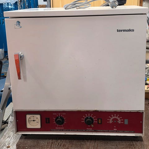 Hyvä teräsverkkorunkoinen raku-uuni, vuorattu karhuvillalla ja kaoliinilla. Ulkomitat 65x65x65cm, sisämitat 42x42cm, syvyys 55cm. Ulostuloputket tehty keraamisesta kivitavarasta. Kannen paksuus n. 9cm, Hyvät nostokahvat.